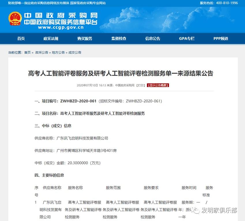 讯飞子公司——讯飞启明中标湖北省教育考试院人工智能阅卷项目 | 来源:中国政府采购网[15]