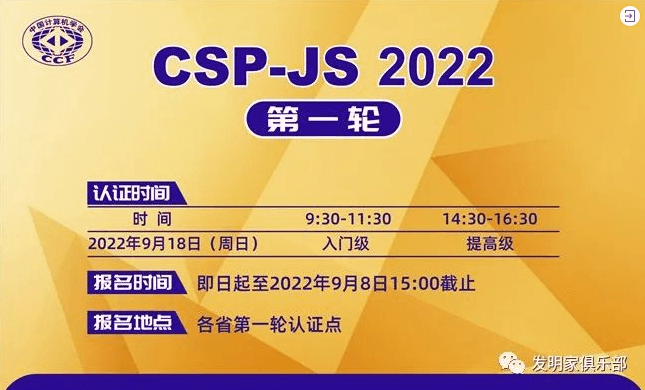 2022非专业级软件能力认证(CSP-JS 2022)第一轮将于9月18日举行。即日起开始认证报名,具体如下: